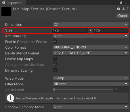 Назовём данную текстуру MiniMapTexture. А в инспекторе в поле Size укажем значения, например, 175. Это размер нашей мини карты.