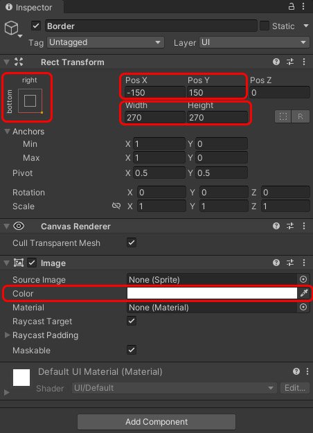 Внутри канваса создадим объект UI - Image, который будет служить нашей рамкой. Назовём данный объект Border. Теперь настроим его компоненты: