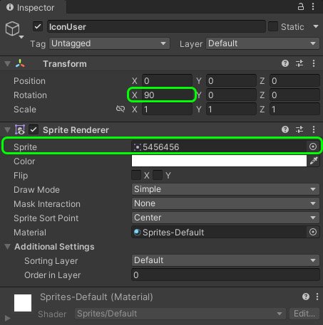 Первым делом с помощью окна Hierarchy создадим пустой объект внутри нашего парсонажа(ПКМ - Create Empty). Назовём данный объект IconUser. Данному объекту в окне Inspector присвоим компонент Sprite Renderer. После чего производим следующие настройки: