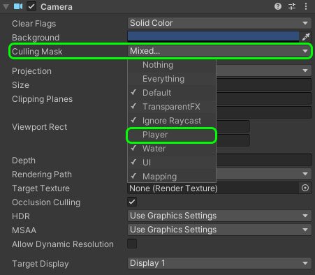 Далее для нашей верхней камеры в окне Inspector в поле Culling Mask снимите галочку со слоя Player.