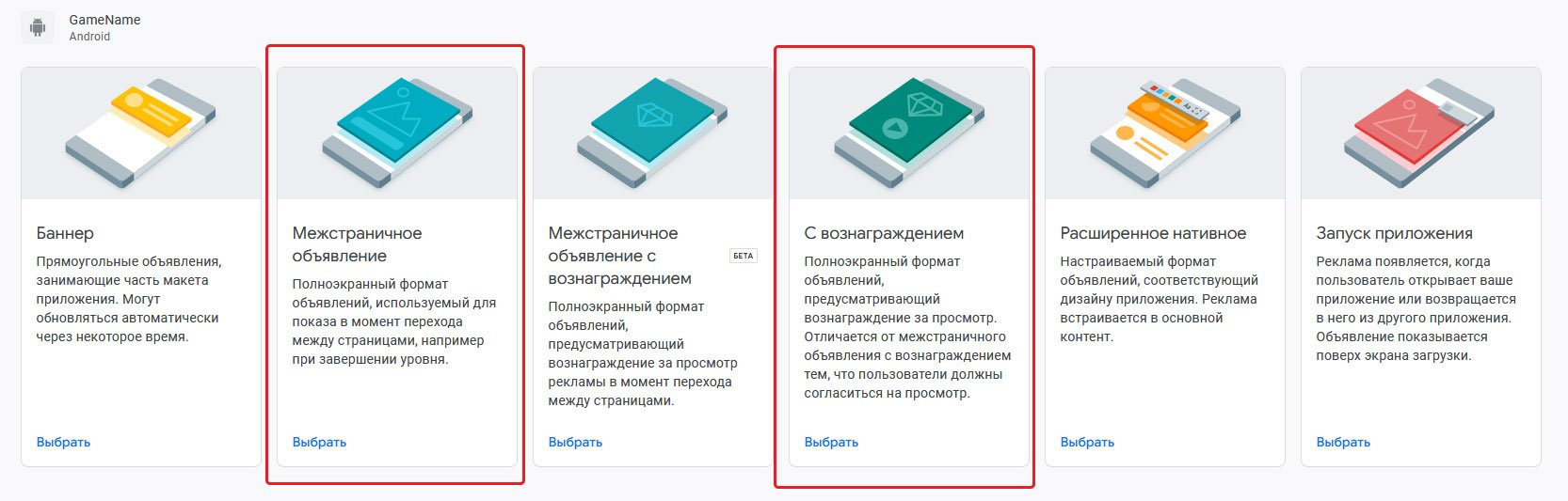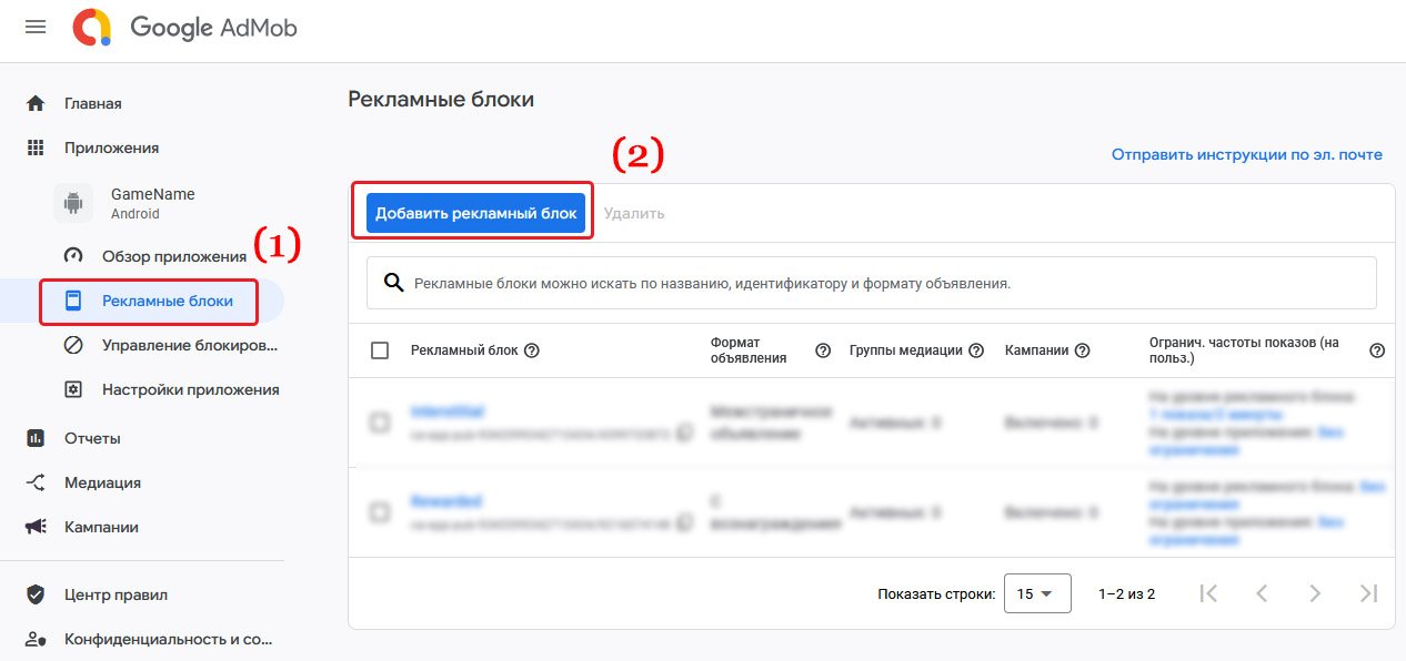 Google AdMob предоставляет 6 видов рекламных блоков. Мы рассмотрим только два из них, то-есть самые популярные, а именно "Межстраничное объявление" - Interstitial, и "С вознаграждением"- Rewarded. Эти два вида рекламных блоков необходимо создать.