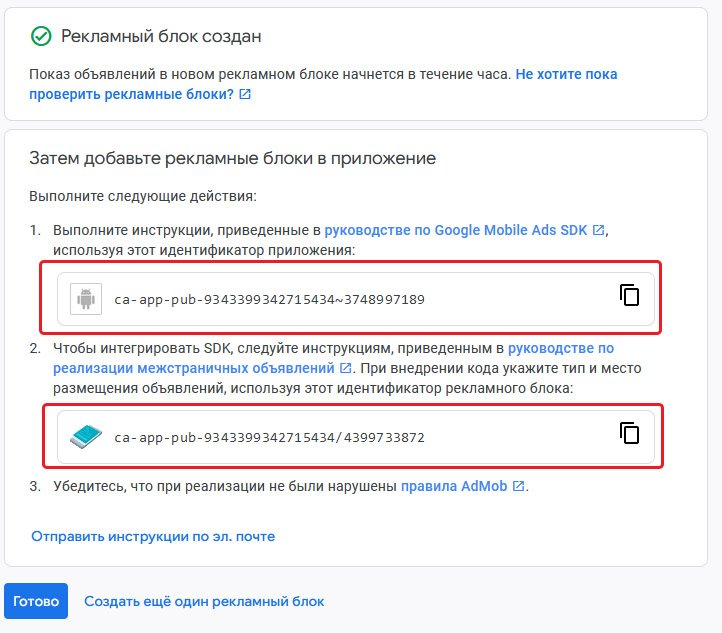 Псоле создания данных блоков, для вас сгенерируют уникальные идентификаторы для вашего приложения(в моём случае для Android), а так же уникальные идентификаторы для ваших рекламных блоков. В дальнейшем мы их будем использовать в скрипте.