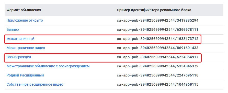 Нам ещё понадобятся не только настоящие идентификаторы рекламных блоков, но и тестовые! Google предоставляет тестовые рекламные ID для каждого вида рекламы по этой ссылке: https://developers.google.com/admob/android/test-ads.