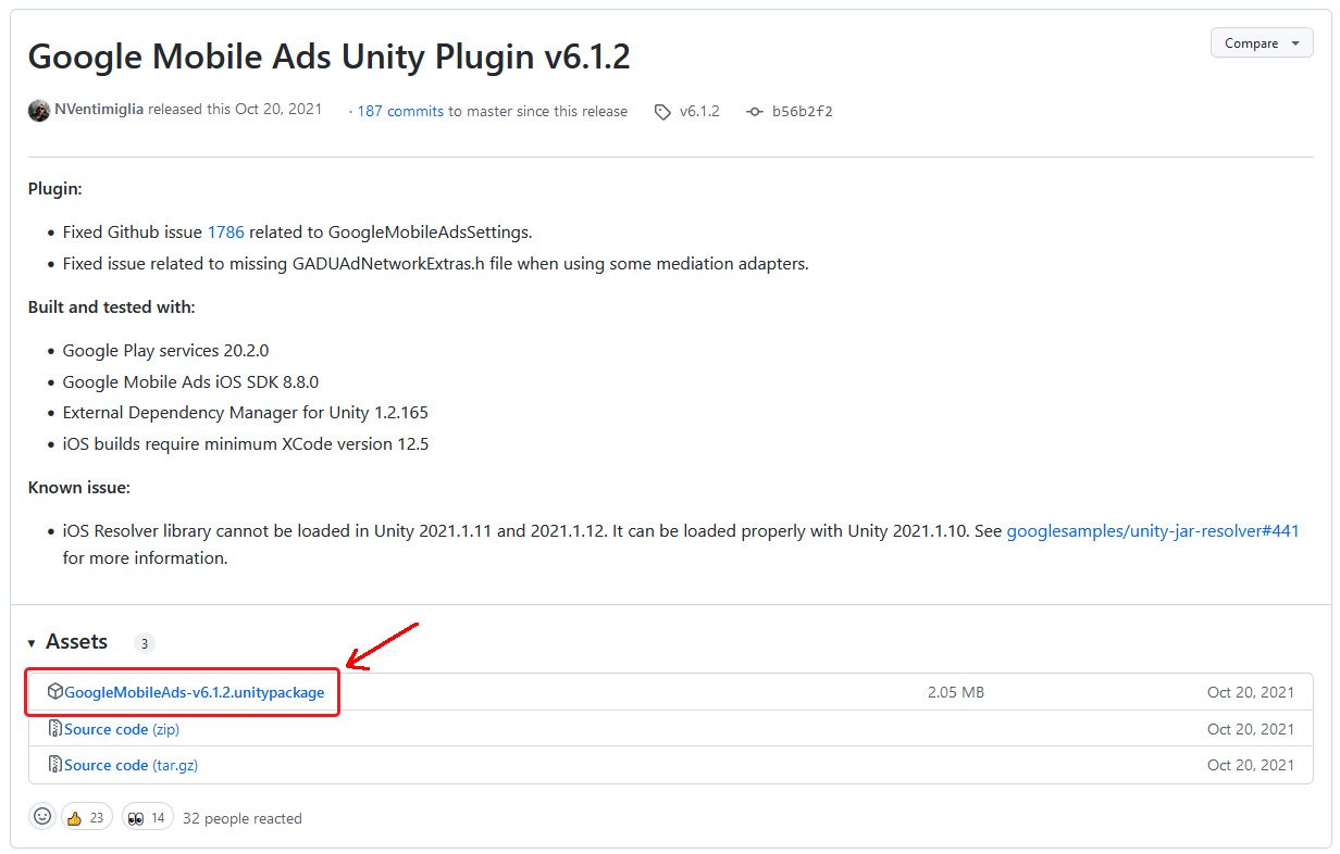 Конечно же, мы будем исользовать готовые рекламные методы, которые предоставляет сам гугл, поэтому нам необходимо скачать специальный плагин(ассет) по данной ссылке, и загрузить его в проект. На момент написания данной статьи, версия плагина v6.1.2.