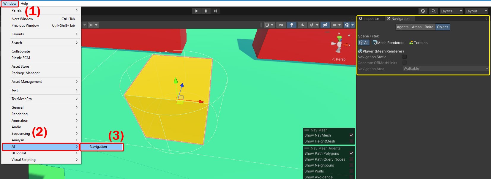 Агента для NavMesh мы создали, теперь необходимо создать сам NavMesh. Для этого переходим во вкладку Window - AI - Navigation, и после этого откроется окно Navigation, которое будет автоматически встроено рядом с окном Inspector.
