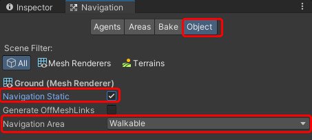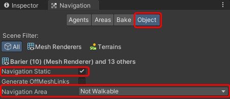 - Создание самого NavMesh, по которому будет ходить Агент. В неё входит не только объект земли Ground, но и все препятствующие элементы Barier, которые будет обходить Агент.