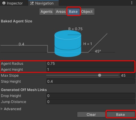 Остались все эти настройки запечь. Для этого переходим во вкладку Bake, и в полях Agent Radius и Agent Height указываем те значения, которые мы указывали в агенте. Напомню, у меня эти значения были: Radius = 0.75, Height = 1. После чего жмём кнопку Bake.
