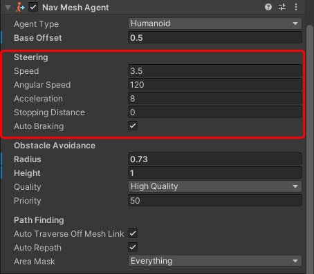 Так же хочу обратить Ваше внимание на то, что благодаря методу SetDestination(), нет необходимости самому писать скрипт передвижения персонажа. Данный метод делает это за вас. Помимо передвижения, он поворачивает персонажа в сторону движения, заносит персонажа на поворотах, и делает много других интересных вещей. Всё это настраивается в компоненте NavMeshAgent в отделе Steering.