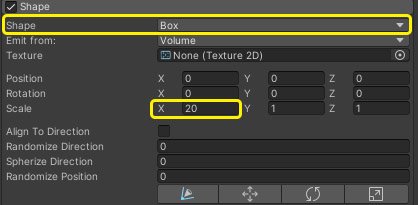 Теперь нам необходимо источник создания частиц растянуть по горизонтали, для этого в разделе Shape, в поле Shape выбираем знаение Box. И далее в поле Scale по оси X указываем значение 20, чтоб растянут данную форму по горизонтали.