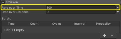 Далее в разделе Emission в поле Rate over Time можно указать количество создаваемых частиц за секунду времени. Я хочу чтобы частиц было очень много, и поэтому установлю здесь значение 100.