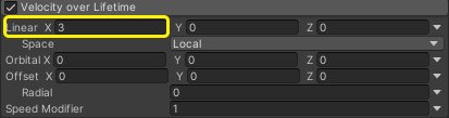 Далее можно сделать, чтобы дождь падал под небольшим углом, иммитируя ветер. Для этого в разделе Velocity over Lifetime в поле Linear для значения X указываем число, например, 3.