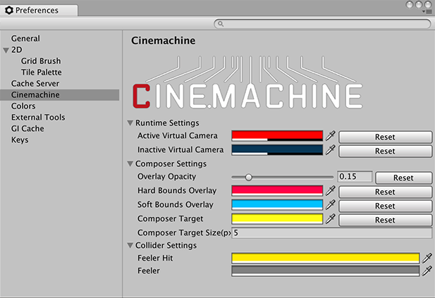 Некоторые пакеты Asset Store или Unity добавляют собственные настройки в окно Настройки. Обычно они используют имя пакета в качестве категории предпочтений. В этом примере вы можете увидеть настройки Cinemachine: