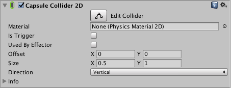 | Used by Effector | Установите этот флажок, чтобы указать, что подключенный эффектор использует этот капсульный коллайдер 2D. |