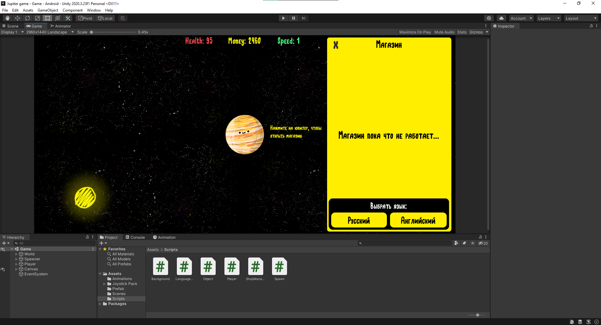 Я буду показывать на примере своего проекта. В нём есть уже готовый текст, и две кнопки, с помощью которых мы будем переключать язык с русского на английский. Но вы таким методом можете создавать куда больше языков для вашей игры.