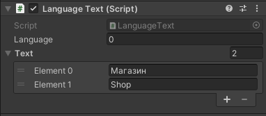 Переменная language, это как код для нашего языка. Допустим число 0 - это будет русский язык, число 1 - это английский, и так далее. И ниже в инспекторе скрипта мы указываем количество наших языков, вписывая варианты текста в нужном порядке. Первый вариант на русском языке, второй на английском.