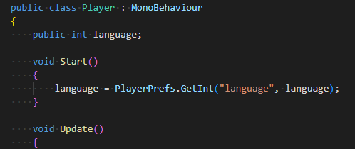 И после нужно создать два метода, для кнопок. Как мы видим в каждом методе для определённого языка есть три строчки. На первой строчке мы меняем значение language. На следующей строчке это значение сохранится. А строчкой ниже произойдёт перезагрузка сцены, и кстати в скобочках незабудьте написать правильное название вашей сцены..