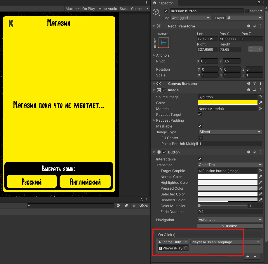 Далее нужно не забыть указать кнопкам эти методы. Метод который переключает язык на русский, нужно назначить для соответствующей кнопке в инспекторе. Собственно таким образом и для другой кнопки.