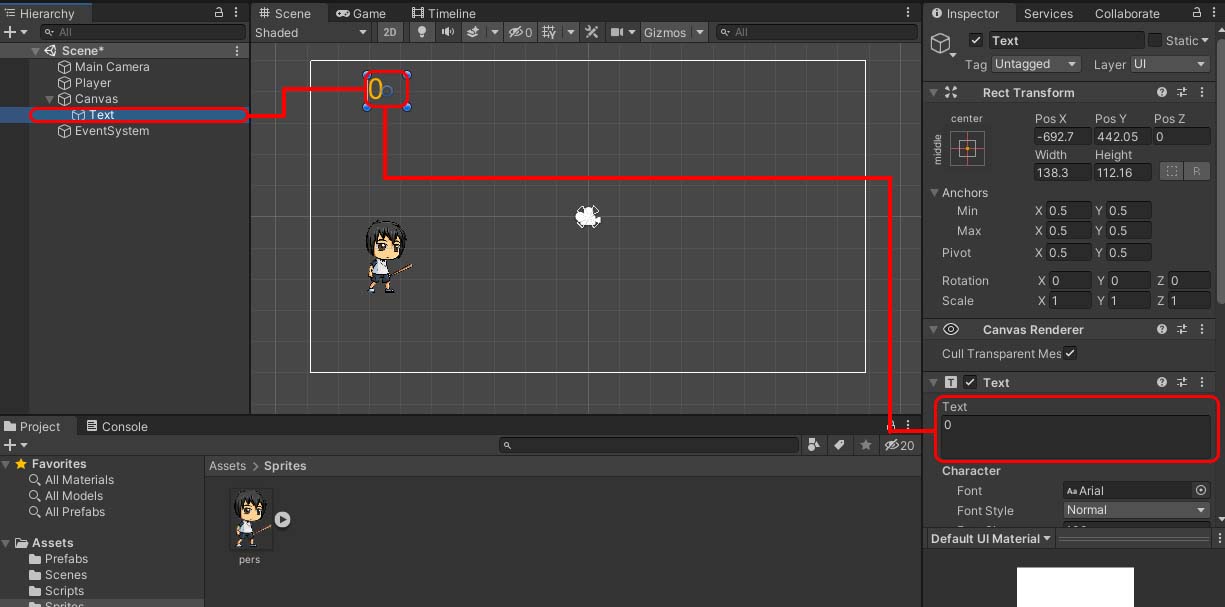 Теперь создадим область, где будет храниться наше значение монет. Для этого создаём игровой объект типа UI – Text. И в окне Inspector в поле Text пропишем 0.