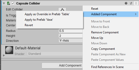 В нашем примере, если выбрано Применить к префабу "Ваза" и префаб "Стол" имеет переопределение значения, это переопределение в префабе "Стол" одновременно отменяется. чтобы свойство экземпляра сохраняло только что примененное значение. Если бы это было не так, значение экземпляра изменилось бы сразу после применения.