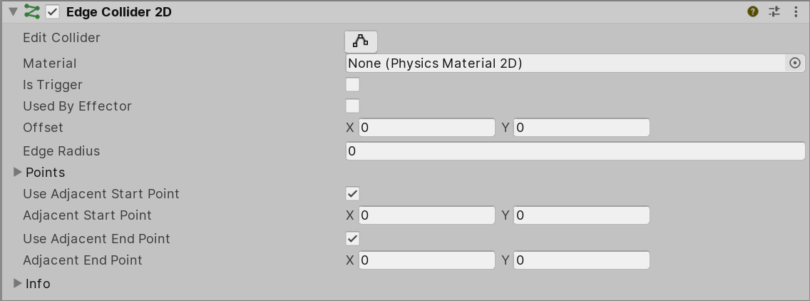 | Use Adjacent Start Point | Включите это свойство, чтобы рассчитать столкновениеСтолкновение происходит, когда физический движок обнаруживает, что коллайдеры двух игровых объектов соприкасаются или перекрываются, когда по крайней мере один имеет компонент Rigidbody и находится в движении. Подробнее Смотреть в Словарь, используя Смежную начальную точку для формирования нормали столкновения, когда столкновение происходит в начальной точке Edge Collider. |